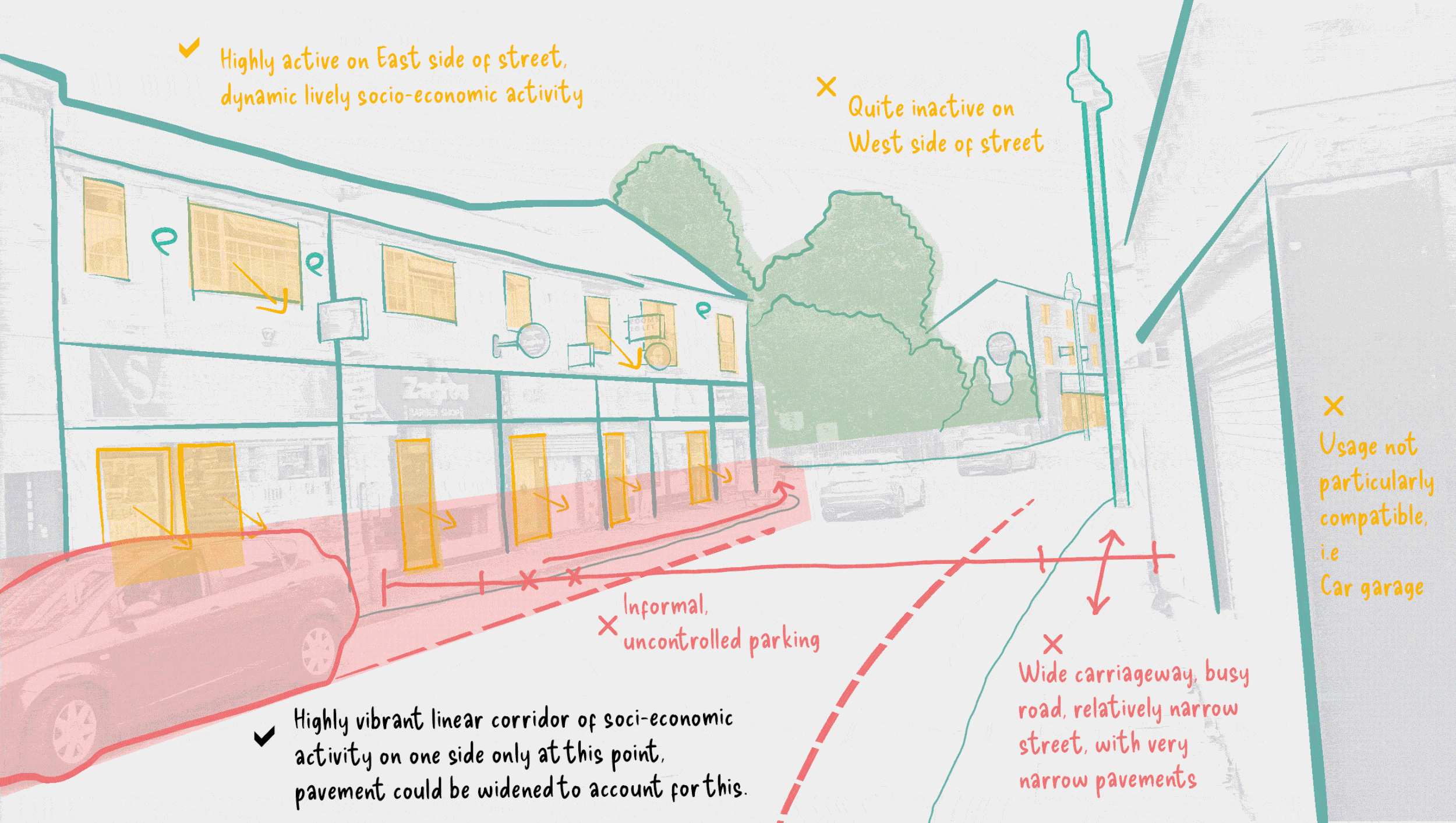 In this specific area, there’s a notable concentration of socio-economic activity along one side of the street, creating a vibrant and bustling corridor. However, this high level of activity can sometimes lead to congestion and overcrowding on the pedestrian walkway. One potential solution to address this issue is to widen the pavement or sidewalk to accommodate the increased foot traffic.