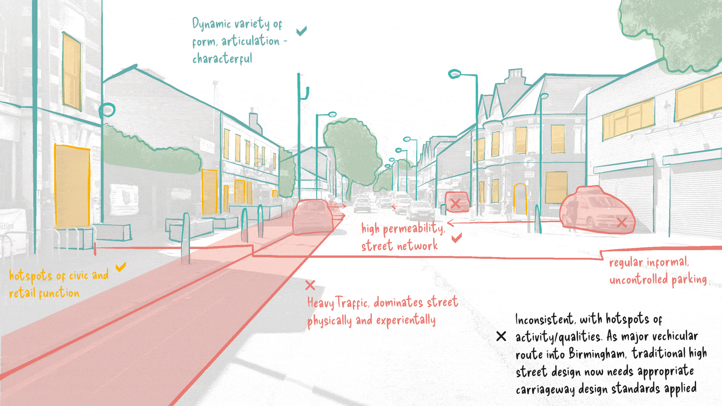 The neighbourhood’s character is multifaceted and sometimes unpredictable, defined by easily navigable thoroughfares interspersed with vibrant pockets of social engagement. These focal points correspond with the traditional linear street corridors that serve as primary arteries leading towards central Birmingham. However, the dominance of vehicular traffic along these routes often compromises the overall quality of the environment.