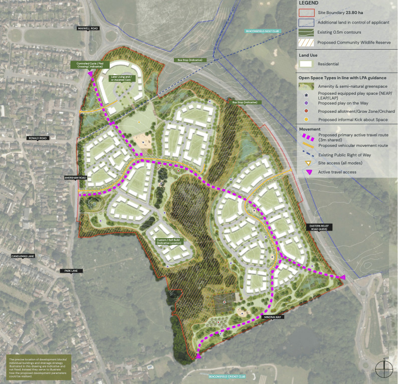 Define Planning and Design was appointed by Catesby Estates to support the preparation of a new planning application for a strategic residential site in Beaconsfield, following the refusal of an earlier scheme at appeal in December 2022 (which we were not involved in). The commission required a fundamental review of the previous proposals and a clear, evidence-based response to the Planning Inspector’s conclusions, with a focus on a genuinely landscape-led approach.