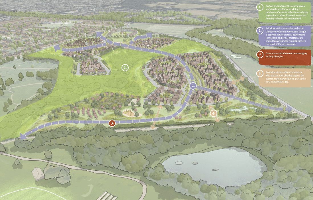 • Development of an integrated green infrastructure framework to guide landscape structure, open space provision, ecological enhancement and sustainable drainage