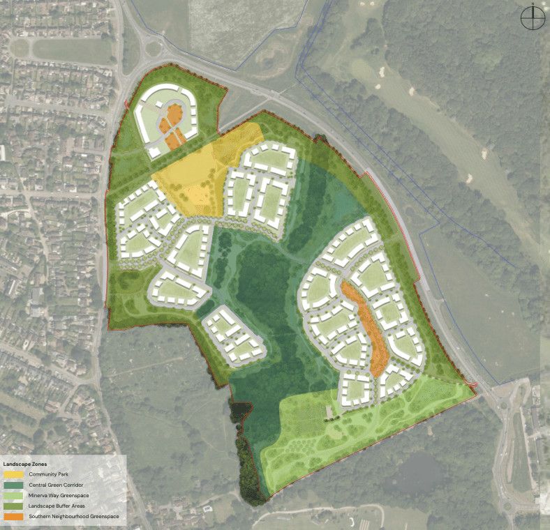 • Landscape-led masterplanning to reshape the site structure, development parcels and relationship with surrounding landscape and settlements