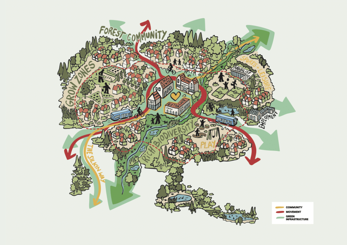 Bratton Green is located to the north-west of the urban area of Telford, a third-generation New Town designated in 1968. The planning and design of Telford was inspired by a number of founding ambitions, some of which remain relevant today, including the creation of places that are characterised by generous open space provision and access to local facilities within walking distance.