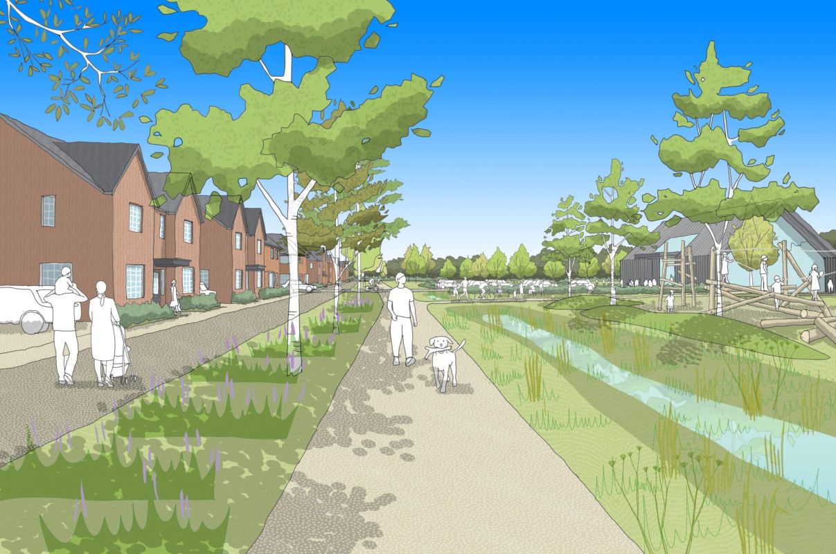 A collaborative and iterative process to understand the sites constraints and opportunities has identified clear design principles, which underpin the vision and Masterplan for Bratton Green. The site benefits from having extensive views toward the Wrekin and Ercall, iconic landscape features that define much of Telford and the surrounding countryside. Existing watercourses cross the site and, whilst associated flood risk has been carefully addressed, they offer unique opportunities to provide biodiversity net gain and to create engaging open spaces.