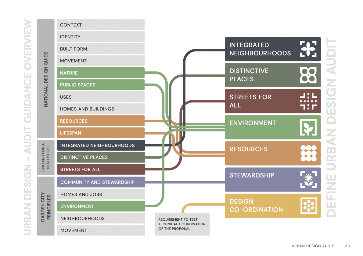 Define used their masterplan audit methodology for large scale new communities, which was based on a combination of the National Design Guide’s ten characteristics of a successful place, the nine Garden City Principles and the three sections of Building for a Healthy Life.