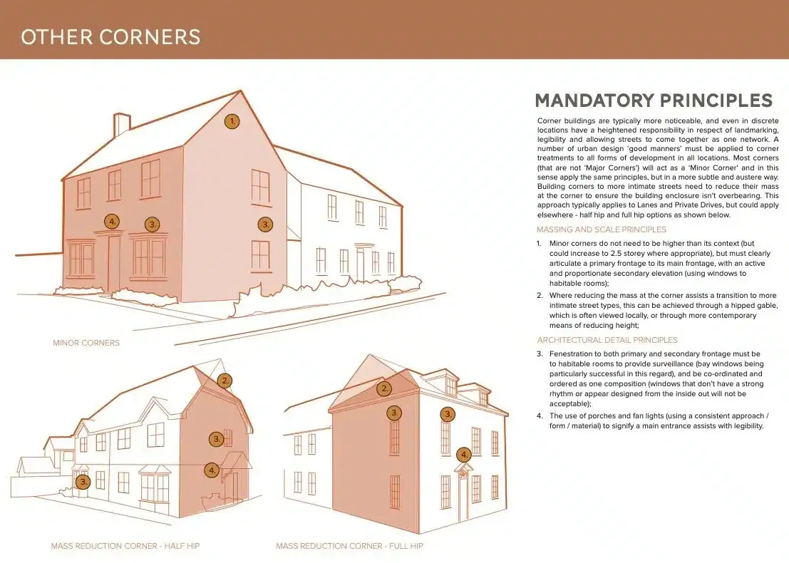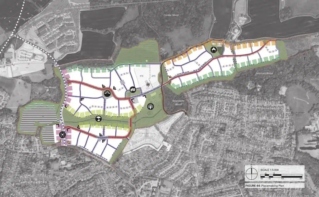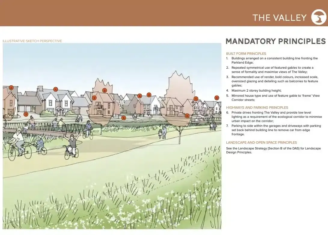 In this case, we developed a Placemaking Strategy that focused on a series of ‘Places’, inspired by landscape or heritage: The Valley, the High Point, Roundacre, Upper and Lower Woodford Barns, which in turn interact with a variety of Street Types, Edges and Landmarks, all responding to key site features that collectively create a cohesive approach to character. Our open approach and appreciation of existing site features transformed relations with the LPA and Members, to creating goodwill and support.