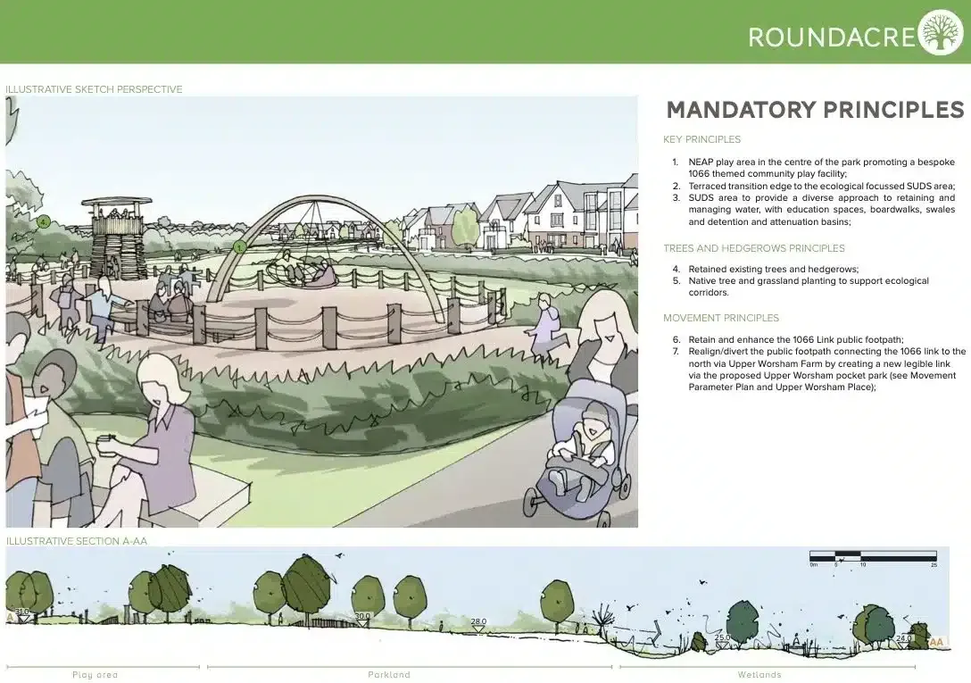 From the moment we viewed the site, our team could see this site was something special. Its rolling topography, historic barns, 1066 footpath link (which leads northwards to Battle) and rich mature woodland setting gave us plenty of inspiration.