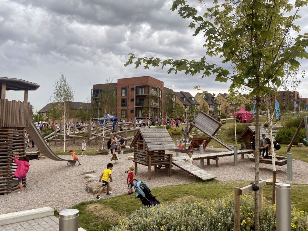 At the lower part of the site there is a large play area which we designed in conjunction with TimberPlay UK. The design provides a wide range of play opportunities for all ages and abilities as well as utilising natural boundaries with level changes rather than fences.