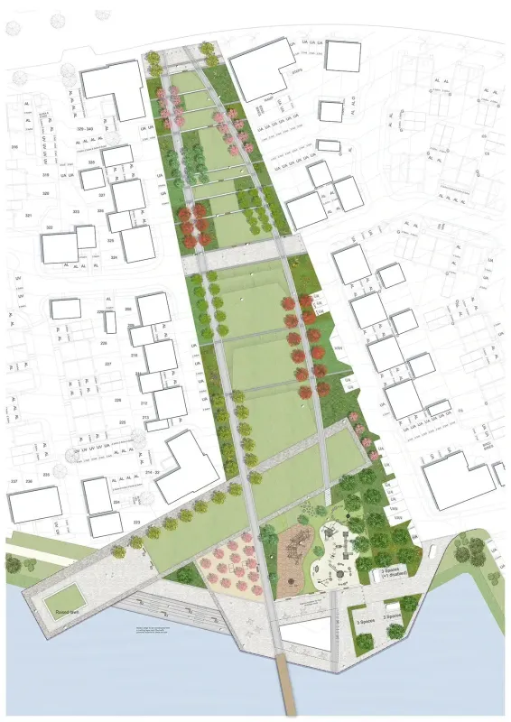 Prior to designing the park, we developed the residential masterplan to maximise views out to the water, shaping the development areas and creating an aperture in the built form. Following this we designed the park to enhance these views through terracing, waterfront design and tree vistas.